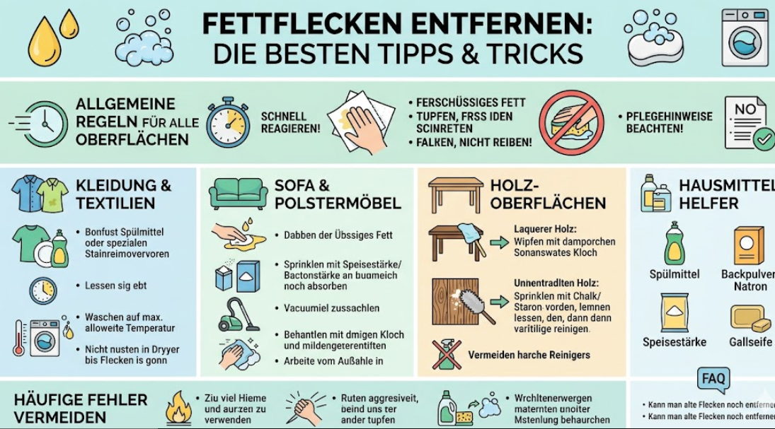 Fettflecken entfernen gehört zu den Themen, die im Alltag fast jeder früher oder später googelt. Ein Spritzer Salatdressing auf dem Shirt, ein Butterfleck auf der Tischdecke oder ein Ölfleck auf dem Sofa reicht schon aus, um aus einem kleinen Missgeschick ein hartnäckiges Reinigungsproblem zu machen. Genau deshalb ist es wichtig zu wissen, wie man schnell, richtig und materialschonend handelt.